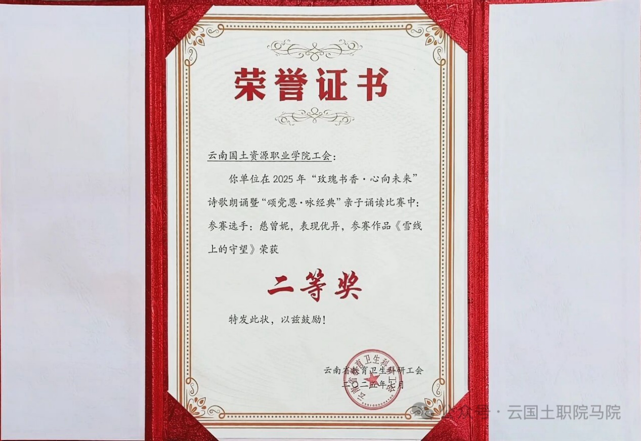 慈曾妮老师在云南省教育卫生科研工会“玫瑰书香·心向未来”诗歌朗诵暨“颂党恩·咏经典”亲子诵读比赛中荣获二等奖