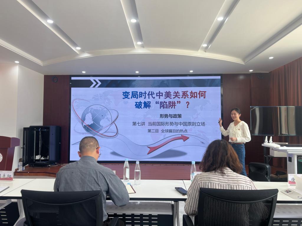 蒋云朋、李成萍、谭钟培、金秋四位青年教师分别代表习近平新时代中国特色社会主义思想概论课教研室、思想道德与法治课教研室、形势与政策课教研室、毛泽东思想与中国特色社会主义理论体系概论课教研室,根据各自所授课程的教材或教学要点,选定授课专题依次进行教学展示。四位教师以饱满的热情和各具特色的教学风格展示了思政课教师良好的精神风貌。